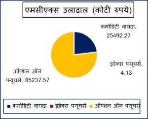 मुंबई: देशातील आघाडीचे कमोडिटी डेरिव्हेटिव्ह एक्सचेंज, एमसीएक्सवर कमोडिटी वायदा, ऑप्शन्स आणि इंडेक्स फ्युचर्समध्ये 110733.96 कोटी रुपयांची उलाढाल नोंदवण्यात आली. कमोडिटी वायदामध्ये 25492.27 कोटी रुपयांची उलाढाल झाली, तर कमोडिटी ऑप्शन्समध्ये 85237.57 कोटी रुपयांची (कल्पनात्मक) उलाढाल झाली. बुलियन इंडेक्स बुलडेक्स एप्रिल वायदा 22453 अंकांच्या पातळीवर ट्रेड करत होता. कमोडिटी ऑप्शन्समध्ये एकूण प्रीमियम उलाढाल 1072.68 कोटी रुपये होती.