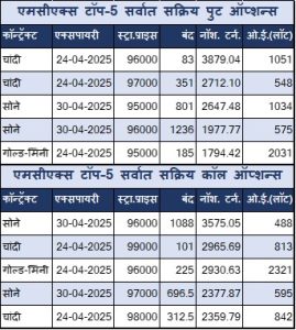 मौल्यवान धातूंमध्ये, सोने आणि चांदीचे वायदामध्ये 14547.00 कोटी रुपयांची उलाढाल झाली. एमसीएक्स सोने जून वायदा सत्राच्या सुरुवातीला 95580 रुपयांवर उघडला, 96188 रुपयांचा उच्चांक आणि 95562 रुपयांचा नीचांक गाठला आणि 94722 रुपयांच्या मागील बंदच्या तुलनेत 1133 रुपये किंवा 1.2 टक्क्यांच्या वाढीसह 95855 प्रति 10 ग्रॅमवर आला. गोल्ड-गिनी एप्रिल वायदा 423 रुपये किंवा 0.56 टक्कानी वाढून 76546 प्रति 8 ग्रॅमवर आला. गोल्ड-पैटल एप्रिल वायदा 74 रुपये किंवा 0.77 टक्क्यांच्या वाढीसह 9647 प्रति 1 ग्रॅमच्या पातळीवर ट्रेड करत होता. गोल्ड-मिनी मे वायदा सत्राच्या सुरुवातीला 95200 रुपयांवर उघडला, दिवसाच्या उच्चांकी 95997 रुपयांवर आणि नीचांकी 95200 रुपयांवर पोहोचल्या आणि 1090 रुपये किंवा 1.15 टक्कानी वाढून 95620 प्रति 10 ग्रॅमच्या पातळीवर ट्रेड करत होता. गोल्ड-टेन एप्रिल वायदा प्रति 10 ग्रॅम सत्राच्या सुरुवातीला 95778 रुपयांवर उघडला, 96257 रुपयांचा उच्चांक आणि 95213 रुपयांचा नीचांक गाठला आणि 94900 रुपयांच्या मागील बंदच्या तुलनेत 800 रुपये किंवा 0.84 टक्क्यांच्या वाढीसह 95700 प्रति 10 ग्रॅम झाला.