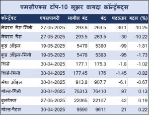 या कमोडिटीशिवाय व्यापार्यांनी ऊर्जा सेगमेंटमध्ये 21610.67 कोटी रुपये व्यवहार केले. एमसीएक्स क्रूड ऑइल मे वायदा आठवड्याच्या सुरुवातीला 5382 रुपये दराने उघडला, आठवड्यात इंट्रा-डेमध्ये 5566 रुपये उच्च आणि 5272 रुपये नीचांकी पातळी गाठून, आठवड्याच्या शेवटी 99 रुपये किंवा 1.81 टक्के घसरणीसह 5380 रुपये बोली लागली. तर क्रूड ऑइल-मिनी मे वायदा 95 रुपये किंवा 1.73 टक्के घसरणीसह आठवड्याच्या शेवटी 5383 रुपये दराने पोहोचला. याशिवाय नेचरल गैस मे वायदा आठवड्याच्या सुरुवातीला 286.9 रुपये दराने उघडला, आठवड्यात इंट्रा-डेमध्ये 289.7 रुपये उच्च आणि 257.6 रुपये नीचांकी पातळी गाठून, 293.5 रुपये गत बंदच्या तुलनेत आठवड्याच्या शेवटी 30 रुपये किंवा 10.22 टक्के घसरणीसह 263.5 रुपये बोली लागली. तर नेचरल गैस-मिनी मे वायदा आठवड्याच्या शेवटी 30.1 रुपये किंवा 10.25 टक्के घसरणीसह 263.5 रुपये दराने पोहोचला.