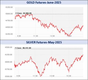 मौल्यवान धातूंमध्ये, सोने आणि चांदीचे वायदामध्ये 12872.93 कोटी रुपयांची उलाढाल झाली. एमसीएक्स सोने जून वायदा सत्राच्या सुरुवातीला 95000 रुपयांवर उघडला, दिवसाच्या उच्चांकी 95038 रुपयांवर आणि नीचांकी 94145 रुपयांवर पोहोचल्या आणि 94992 रुपयांच्या मागील बंदच्या तुलनेत 516 रुपये किंवा 0.54 टक्का घसरून 94476 प्रति 10 ग्रॅमच्या पातळीवर ट्रेड करत होता. गोल्ड-गिनी एप्रिल वायदा 64 रुपये किंवा 0.08 टक्क्यांच्या वाढीसह 76183 प्रति 8 ग्रॅमच्या पातळीवर ट्रेड करत होता. गोल्ड-पैटल एप्रिल वायदा 74 रुपये किंवा 0.77 टक्का घसरून 9544 प्रति 1 ग्रॅम झाला. गोल्ड-मिनी मे वायदा सत्राच्या सुरुवातीला 94809 रुपयांवर उघडला, 95181 रुपयांचा उच्चांक आणि 94300 रुपयांचा नीचांक गाठला आणि 471 रुपये किंवा 0.5 टक्क्यांच्या घसरणीसह 94600 प्रति 10 ग्रॅम झाला. गोल्ड-टेन एप्रिल वायदा प्रति 10 ग्रॅम सत्राच्या सुरुवातीला 94800 रुपयांवर उघडला, दिवसाच्या उच्चांकी 94977 रुपयांवर आणि नीचांकी 94441 रुपयांवर पोहोचल्या आणि 94528 रुपयांच्या मागील बंदच्या तुलनेत 163 रुपये किंवा 0.17 टक्कानी वाढून 94691 प्रति 10 ग्रॅमवर आला.