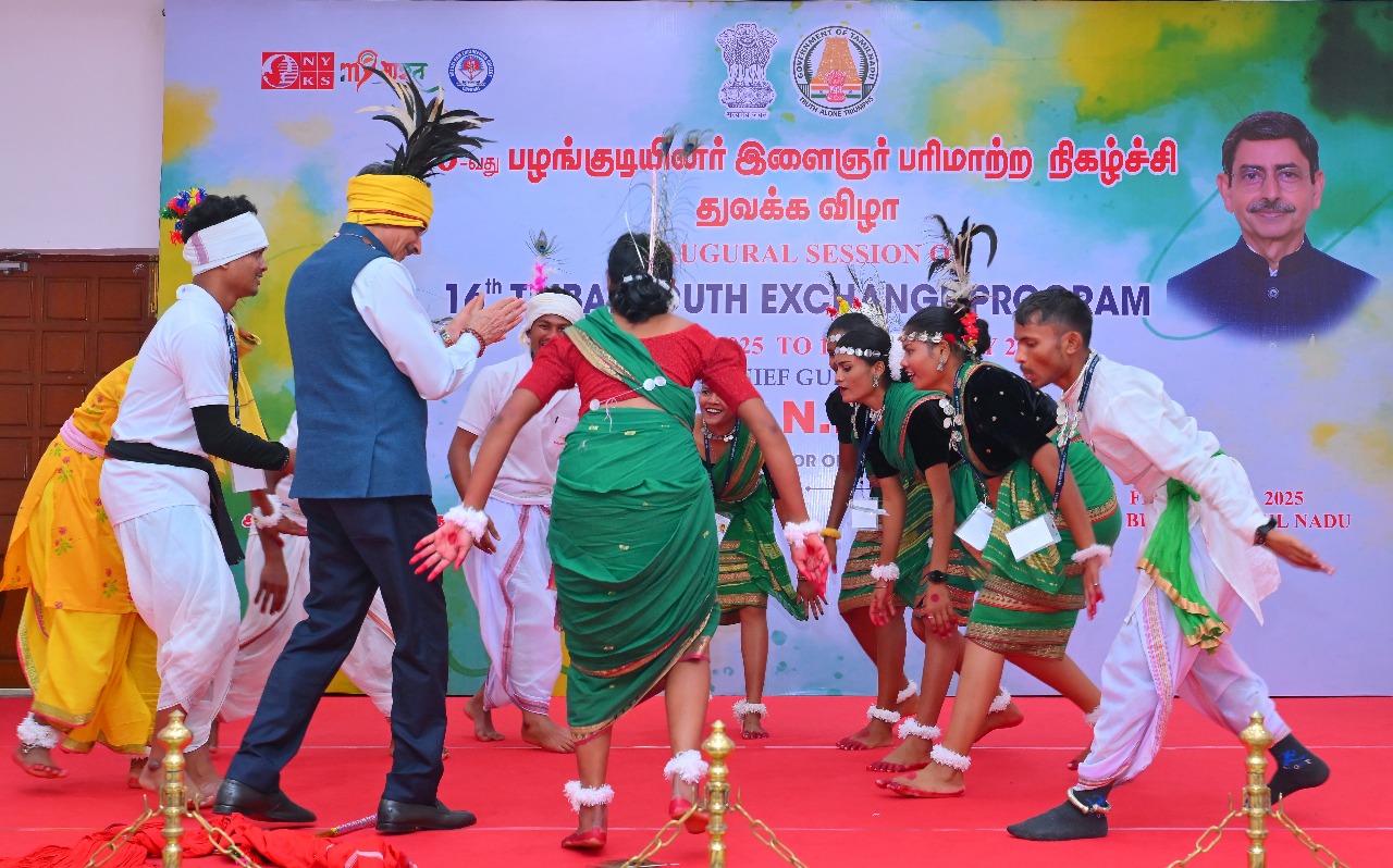 மத்திய இளைஞர் நலன் மற்றும் விளையாட்டுத்துறையின் கீழ் செயல்படும் மை பாரத் (என்ஒய்கேஎஸ்) உள்துறை அமைச்சகத்துடன் இணைந்து 16 வது பழங்குடியின இளைஞர் பரிமாற்ற முகாமை சென்னையில் நடத்துகின்றன. இந்த முகாமினை இன்று (08/02/2015) ஆளுநர் மாளிகையில் நடைபெற்ற விழாவில் தமிழ்நாடு ஆளுநர் ஆர். என் ரவி குத்துவிளக்கேற்றி துவக்கிவைத்தார்.